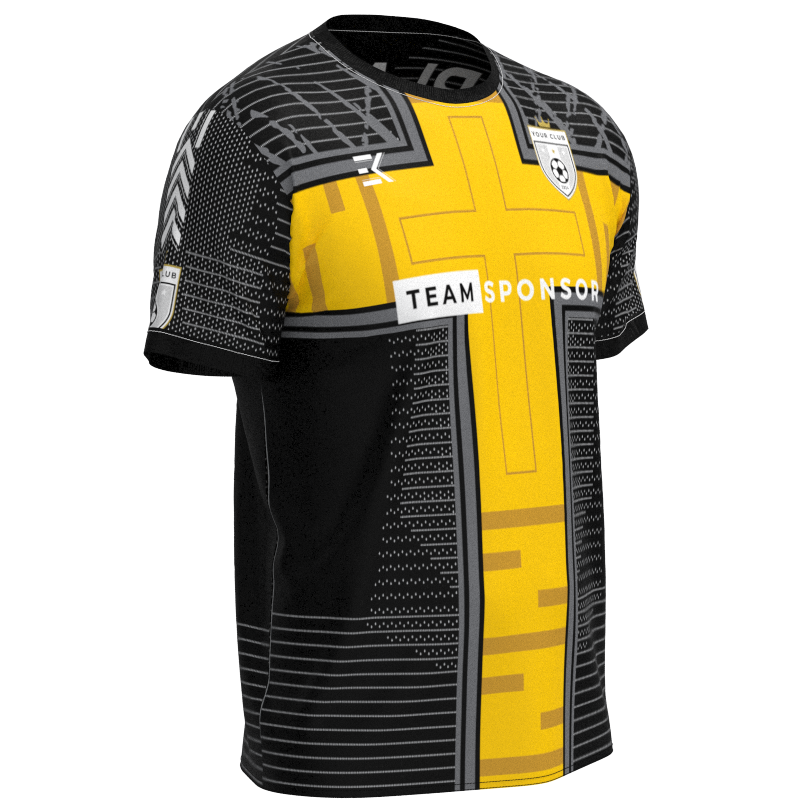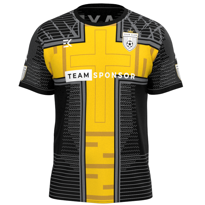 This distinctive XPTCV brings a bold and eye-catching look to the pitch. Featuring a sleek black base complemented by striking panels of deep golden yellow, this kit exudes confidence and style. The subtle variations in the yellow tones, from the rich saffron of the main sections to the more muted ochre of the accents, add depth and texture. Ideal for grassroots teams, Sunday League clubs, and ambitious semi-professional squads, this fully customisable design allows you to put your own stamp on the look, with the option to tweak colours, patterns, and more at no extra cost. With everything included and a low minimum order quantity, this is the perfect solution for teams of all levels.